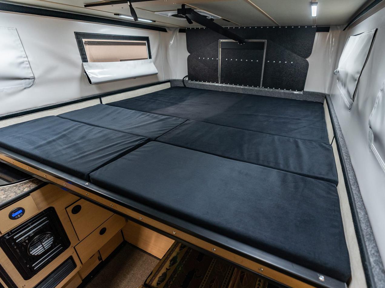 Die Badger Wohnkabine von Four Wheel Campers überrascht mit einem geräumigen Längsbett für zwei bis drei Erwachsene sowie einem Schlafplatz von etwa 165 cm Länge für ein bis zwei Kinder.