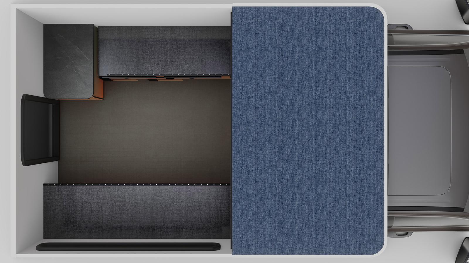 Im großzügigen Innenraum findest du alles, was du für einen Campingurlaub mit einer Wohnkabine benötigst. Standardmäßig verfügen sie über ein ausziehbares Queen-Size Längsbett, auf dem bis zu drei Personen Platz finden können. Die Roll-Over Couch bietet einen weiteren Schlafplatz mit ca. 165 cm Länge.