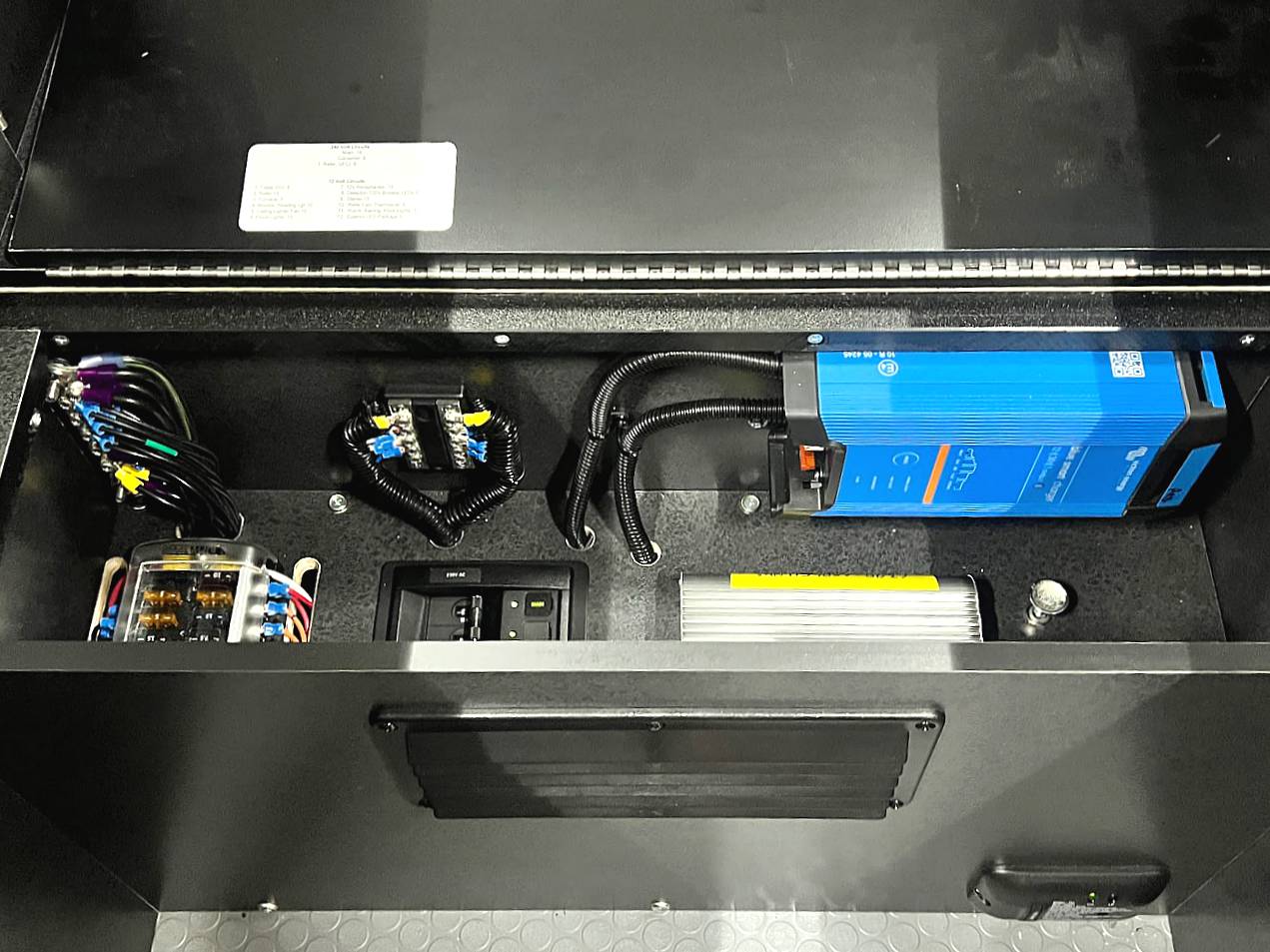 Das vordere Staufach beherbergt die gesamte elektrische Verteilung, sämtliche Sicherungen und das Lademanagement. Standardmäßig ist die Kabine mit einer leistungsstarken 165-Ah-Lithiumbatterie ausgestattet. Ein Victron VCC 1212-30 Ladebooster gewährleistet eine nachhaltige Ladung des Powerpacks, sodass du jederzeit über ausreichend Energie verfügst. Das Ladegerät ist mit einem Solarregler ausgerüstet und kann sowohl über Solarenergie als auch über die Lichtmaschine gleichzeitig laden.
