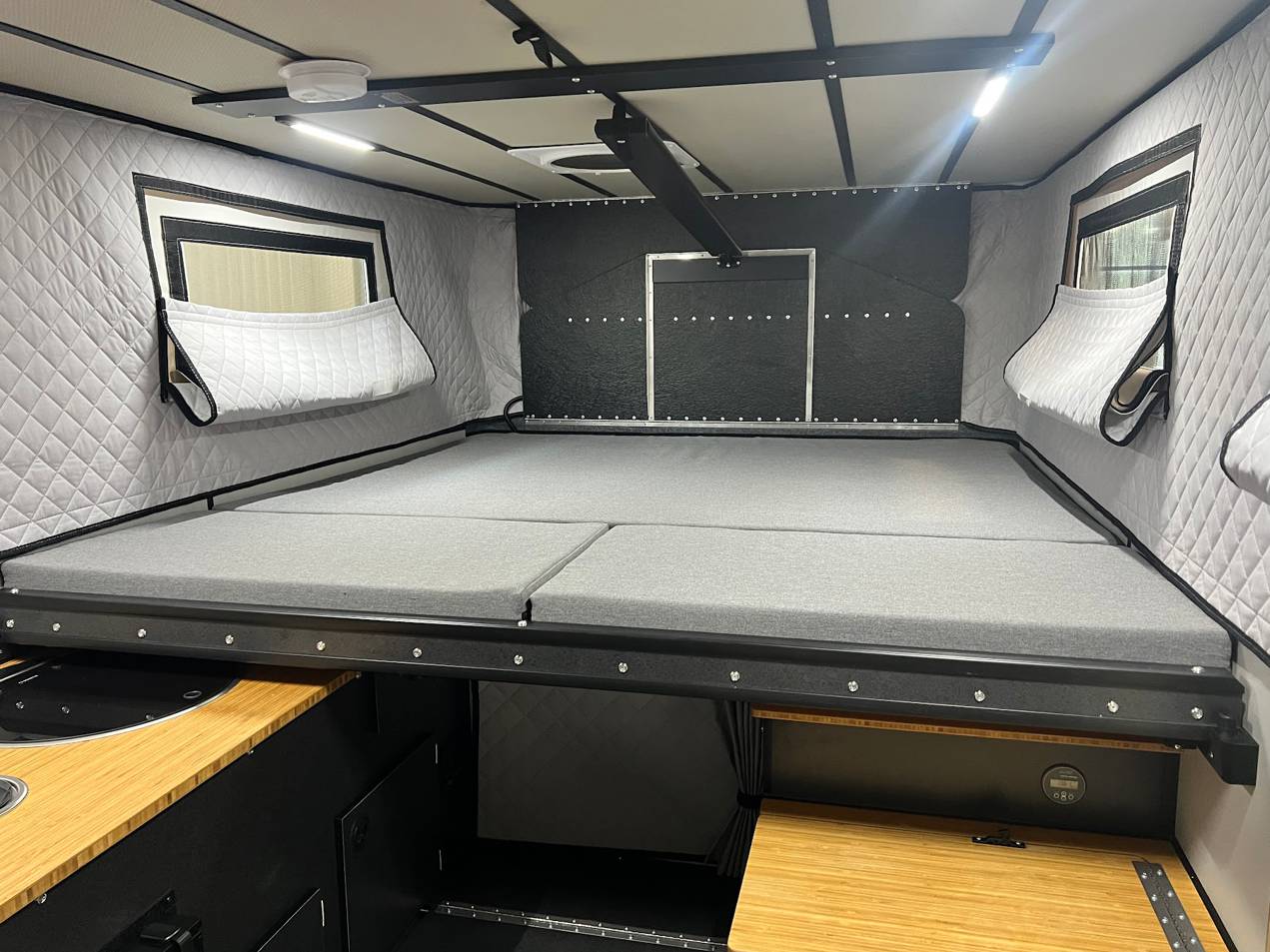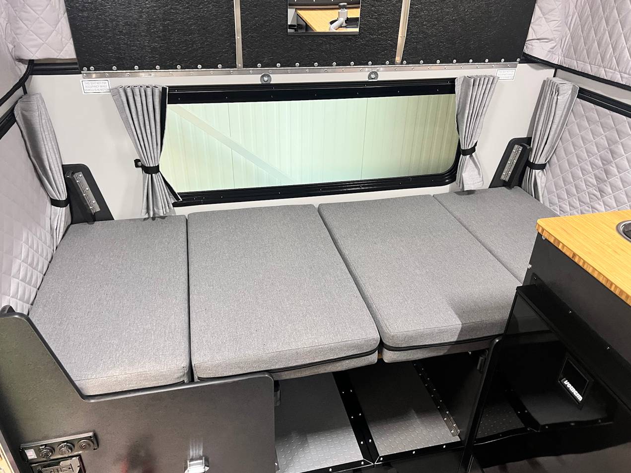 Der Innenraum ist in den Wohn-/Essbereich, die Küche und den Schlafbereich unterteilt. Durch den zentral gelegenen Seiteneingang entsteht eine klare räumliche Trennung der Bereiche. Das großzügige Queen-Size-Bett ist auf eine Größe von ca. 184 x 205 cm ausziehbar und bietet sowohl Quer- als auch Längsschlafmöglichkeiten. Zudem kann die Sitzgruppe in einen zusätzlichen Schlafplatz umgewandelt werden.