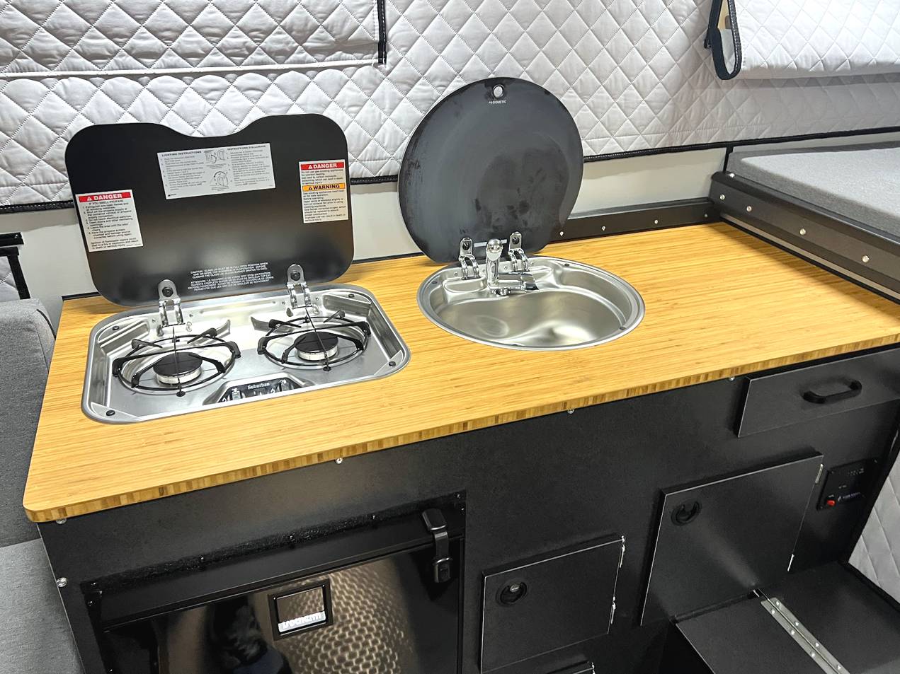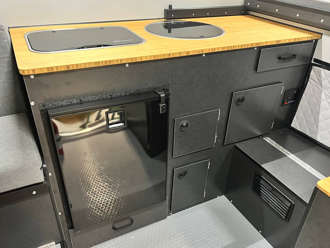 Der Küchenbereich ist, wie bei allen Four Wheel Campers Modellen, mit einem zweiflammigen Herd, einem großen Waschbecken sowie einem 65-Liter-Kompressorkühlschrank ausgestattet.